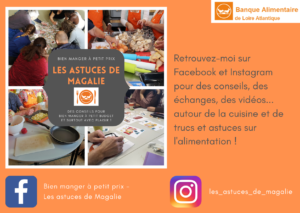 La crise du Covid-19 fait émerger des besoins et une précarité alimentaire grandissante pour de nombreuses familles. Il a donc semblé indispensable à la Banque Alimentaire de Loire-Atlantique de garder le lien avec ceux qui le souhaitent et proposer des conseils pour bien manger à petit budget. Magalie Mbewa-Bondu, conseillère en économie sociale et familiale en charge des actions de nutrition, a donc décidé d’utiliser les réseaux sociaux pour poursuivre sa mission. Un page Facebook et un compte Instagram ouverts à tous et intitulés « les astuces de Magalie » ont été créés :