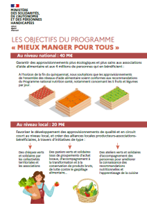 Le 3 novembre 2022, la Première ministre annonçait la création d’un fonds pour une alimentation durable doté de 60 millions d’euros en 2023. Dans la continuité des objectifs fixés par le Gouvernement pour une alimentation saine, durable et de qualité accessible au plus grand nombre, le ministre des Solidarités, de l’Autonomie et des Personnes handicapées lance le programme « Mieux manger pour tous ! ».