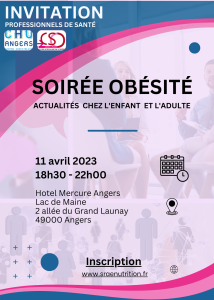 Accueil » Soirée obésité le 11 avril 2023 à Angers Soirée obésité le 11 avril 2023 à Angers Publié le 10 mars 2023 INSCRIPTION ET PROGRAMME Newsletter Vous souhaitez avoir plus d’informations dans le domaine de la nutrition ? Inscrivez-vous à notre newsletter en adhérant de façon non payante à la SRAE Nutrition. Se créer un compte et adhérer à la SRAE Nutrition !