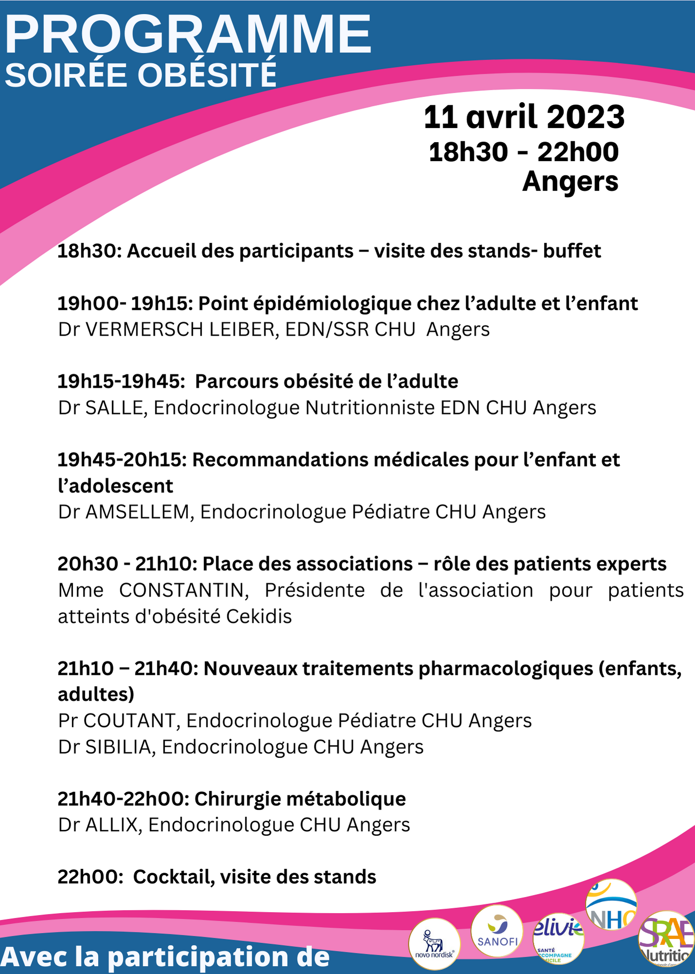 En remplissant ce formulaire vous vous engagez à participer à la soirée obésité organisée par le CHU d’Angers et le CSO Anjou Maine le 11 avril 2023 à 18h30, hôtel mercure lac de Maine, Angers.