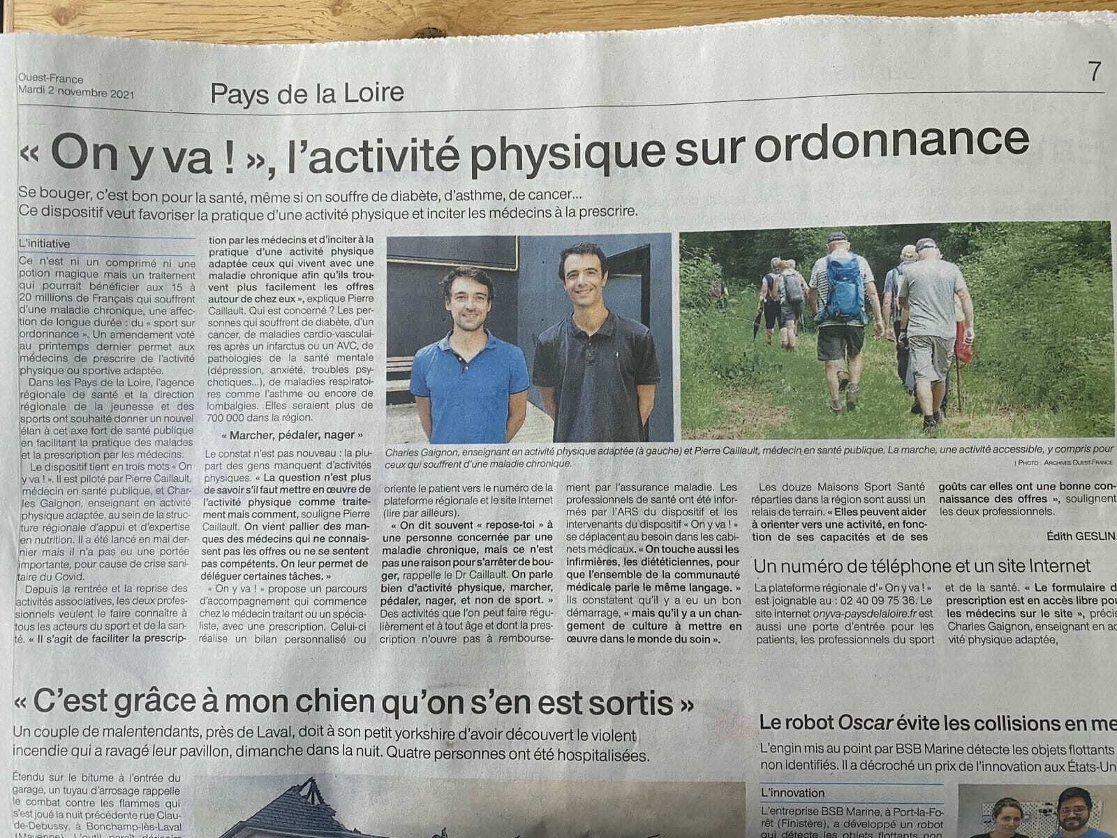 ♦ On y va ! l’activité physique sur ordonnance – Ouest France, pages région – novembre 2021