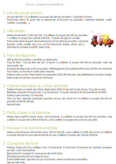 De nombreux établissements ont élaboré leurs propres outils pour aider les patients à enrichir leur alimentation. Ils comprennent souvent des recettes enrichies. N’hésitez pas à les consulter pour vous donner des idées :